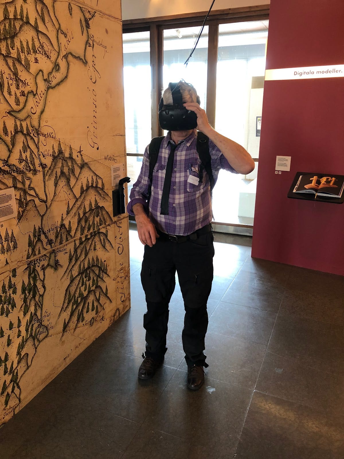 Tohbbe Lindblom from Brunnsmuseet tests VR headset at the Technical Museum on May 17, 2019, in connection with the workshop on Digital cultural heritage. Image by Gustav Fröjdlund.